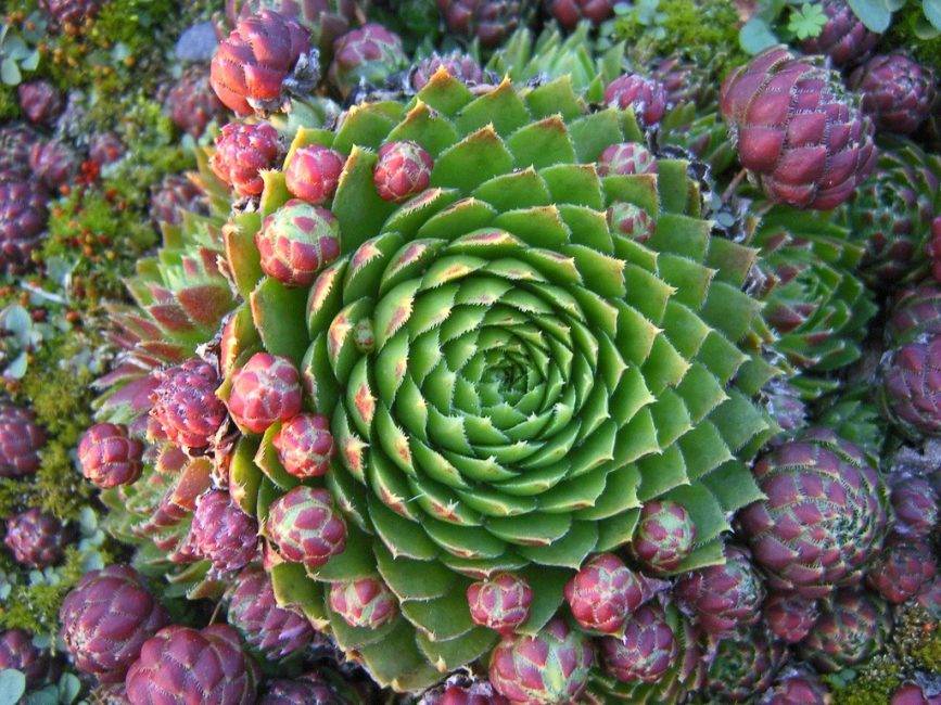 - Молодило. Это многолетнее растение разных оттенков: серебристый, зеленый, бордовый, розовый, желтый.