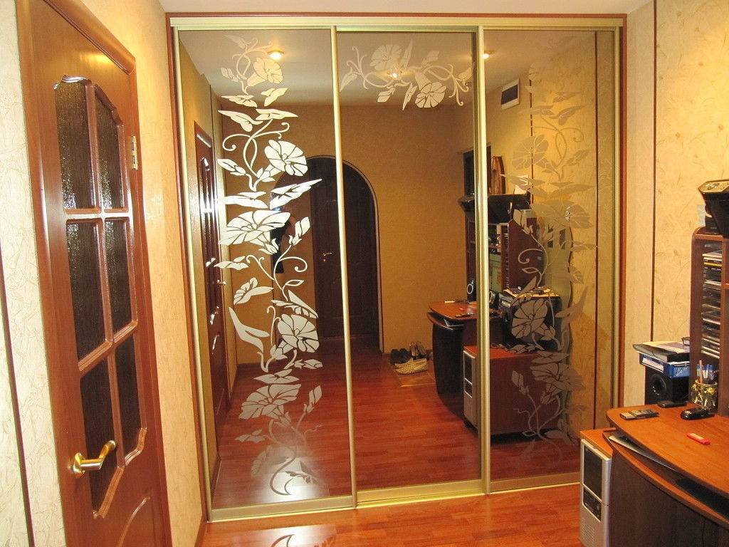 - на раздвижные стеклянные и зеркальные дверцы шкафа-купе рисунки нанесены по-разному. Пескоструйная обработка остается наиболее распространенным методом декорирования стекла. С помощью струи воздуха и песка можно сделать стекло непрозрачным, нанести узор или нарисовать на нем;
