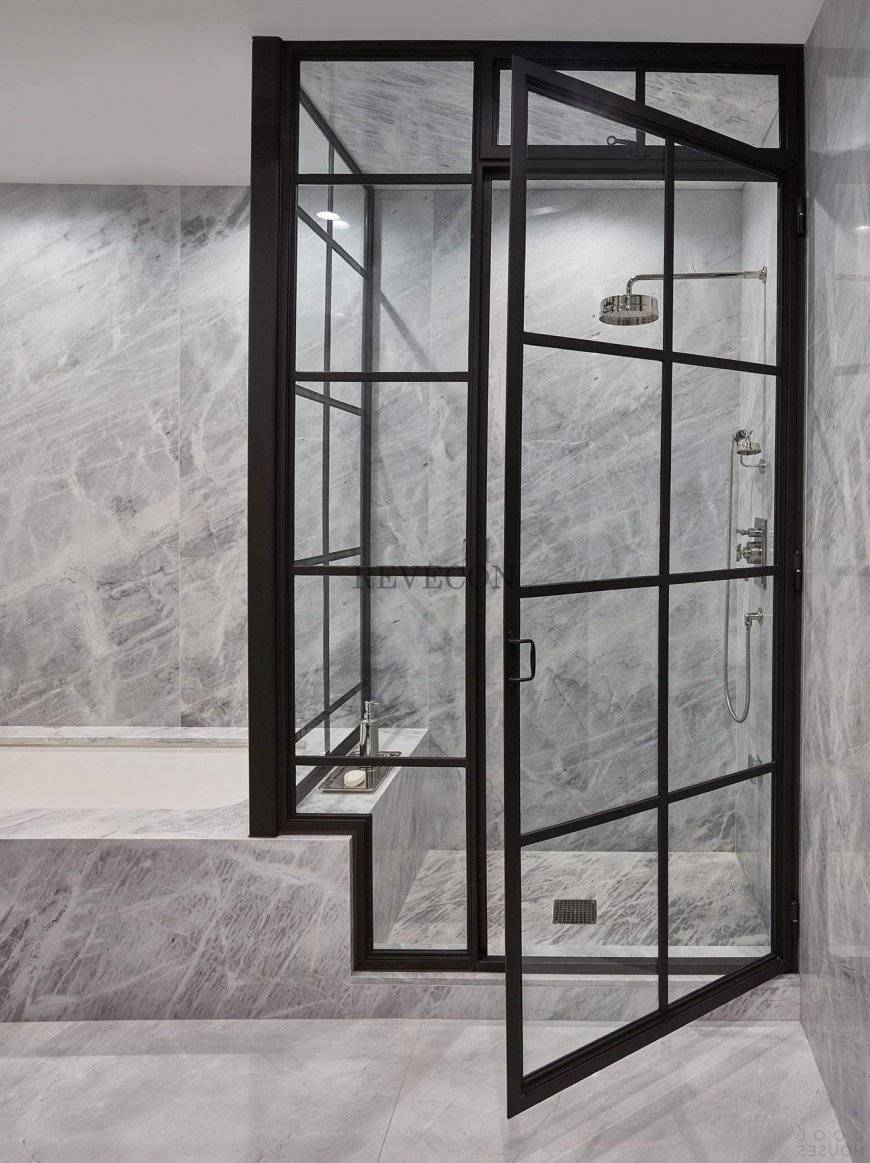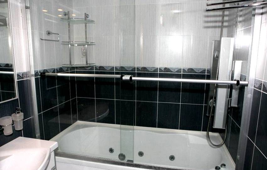 - интерьерная эстетичность — стеклянные панели с красивой фурнитурой и крепежными элементами сделают такую шторку настоящим украшением ванной комнаты;