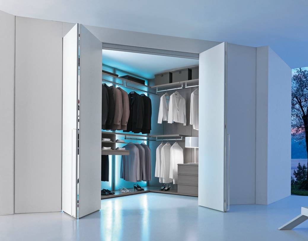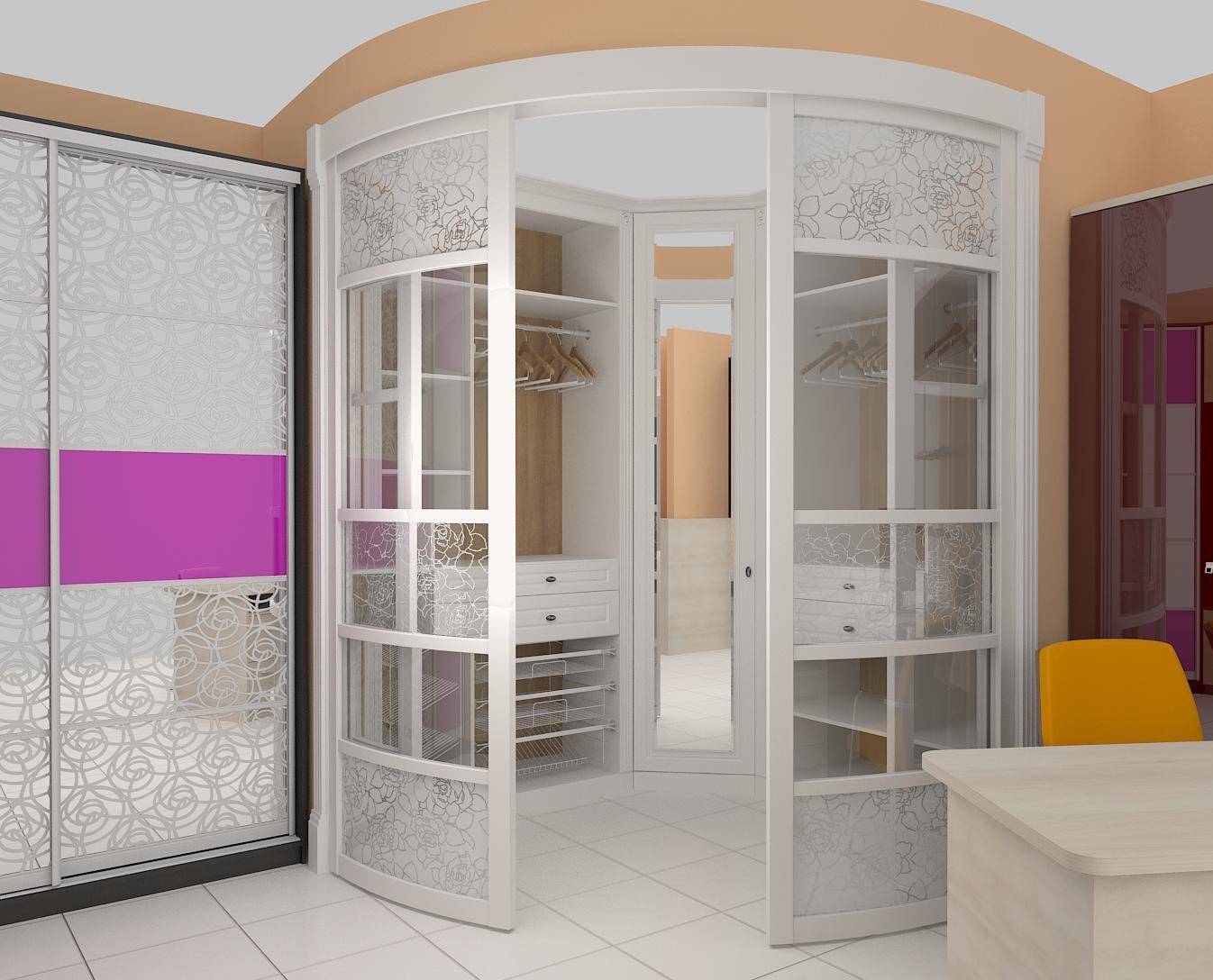 - Радиальные двери для гардеробных – современное и элегантное решение. Система представляет собой перегородку с входными элементами, выполненными не плоско, а криволинейно. Такой вариант экономит место и создает декоративный эффект. Способ перемещения дверей может быть разным, как правило, используются раздвижные системы.