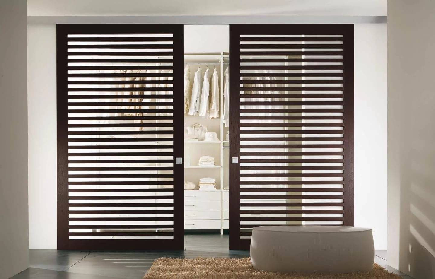 - Реечные двери для гардеробных – это полотна, выполненные в опалубочной технике. Способ перемещения элементов может быть любым, хотя обычно используются традиционные распашные двери. Особенностью этого вида является возможность беспрепятственно пропускать воздух, что позволяет нормализовать микроклимат гардеробной.