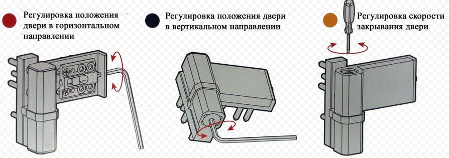 - фронтальное (настраивается плотность прилегания двери к резиновым уплотнителям дверного проема).