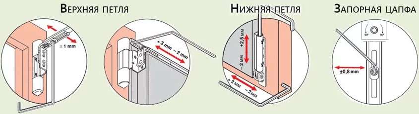 - горизонтальное (регулируется зазор между дверью и петельными стойками сверху, снизу или по всей вертикали);