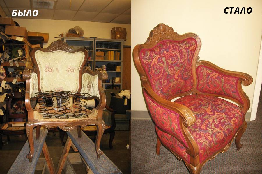 Когда речь идет об обивке мягкой мебели, реставрация подразумевает замену материи, а не всего гарнитура. Для этого проводится перетяжка качественным материалом, обладающим рядом эксплуатационных свойств (прочность, плотность, легкость ухода, долговечность, а также пропитка специальными составами). Такими качествами обладают жаккардовые ткани, материалы из кожи, гобелены и т.д. Пошаговый мастер-класс предполагает следующие этапы реставрации: