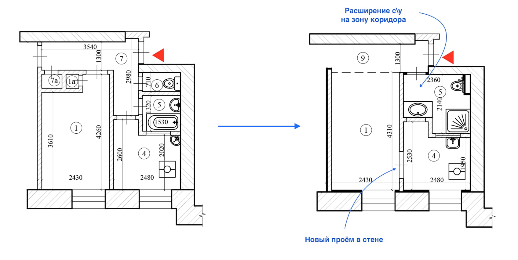 Поэтому эксперты предложили объединить туалет и ванную, добавить площадь за счет коридора, убрать окно в стене между кухней и ванной. До перепланировки в кухню можно было попасть из коридора, но после пришлось сделать новый вход — через комнату.