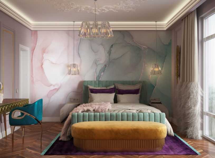 В планировке такой комнаты, как правило, центральное место занимает двуспальная кровать, которую ставят по центру. Эту зону часто выделяют дополнительным декором и освещением, делают акцентную стену. Именно у изголовья кровати уместны фотообои, картины, настенная графика.