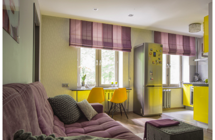 Декор и текстиль – то, что придает типичной двухкомнатной хрущевке оригинальности. Плотные шторы добавляют уюта, но сужают пространство и поглощают свет, поэтому, чтобы не перегружать комнату, стоит выбирать однотонную лаконичную ткань. Яркие декоративные детали (картины, фотообои с модными принтами, акцентные стены) смотрятся выигрышно лишь на нейтральном фоне.