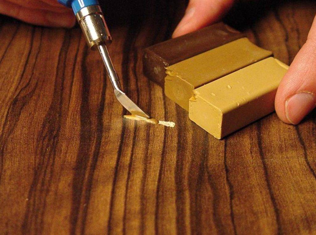 Кроме кремообразной полироли можно воспользоваться твердым восковым карандашом, предназначенным для ухода за дверьми и ламинатом. Чтобы средство заполнило всю поверхность царапины, его плавят на водяной бане.