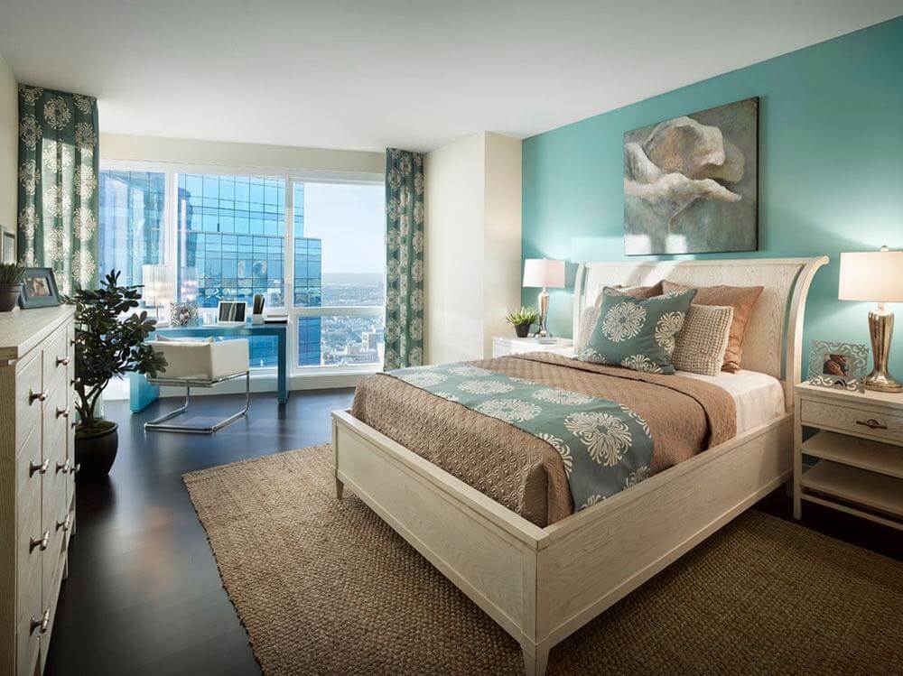 Бывают спальни с бежевой мебелью и бирюзовыми стенами, или же одна стена может быть цвета морской волны.
