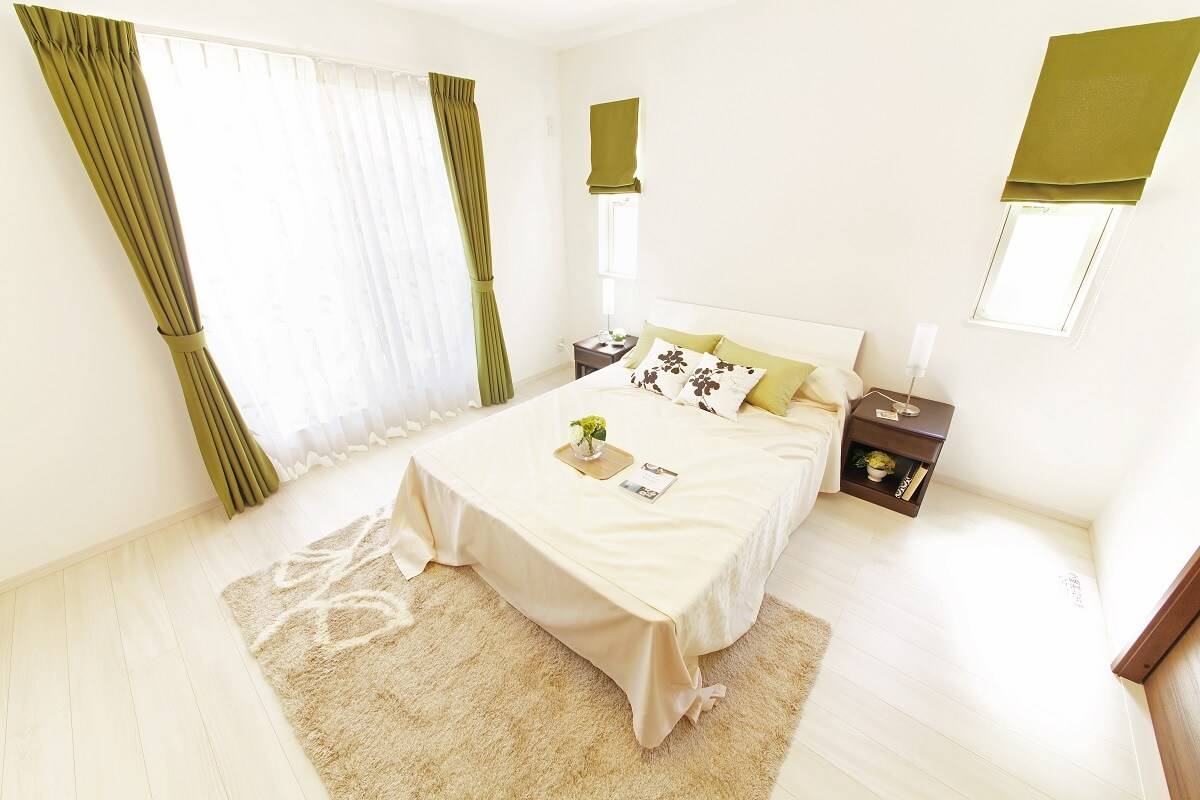 Чистая и уютная бежево-белая спальня с оливковыми шторами кажется очень просторной.