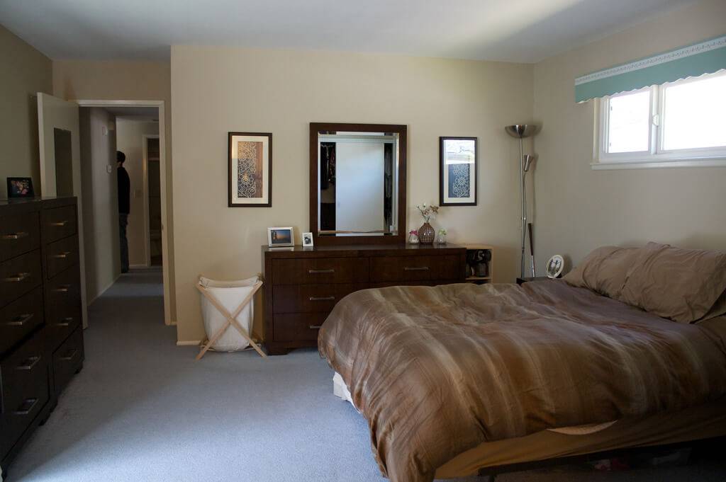 В большой комнате дизайнеры разрешают использование темного заднего плана и светлой мебели. Бежевая кровать смотрится очень большой и парящей над полом. Сочетание коричневых и песочных стен позволяет визуально корректировать неправильность вытянутой (прямоугольной) спальни.