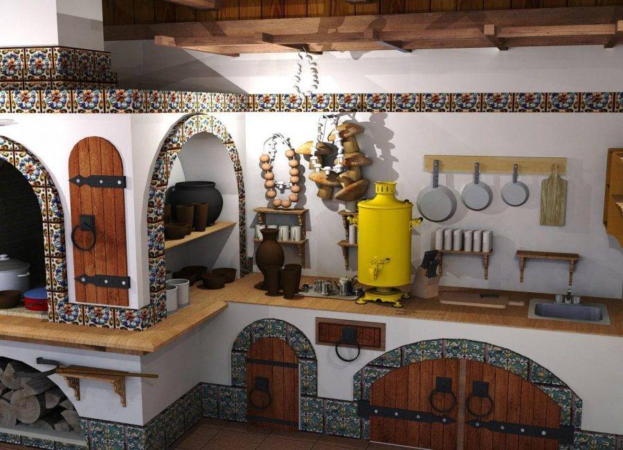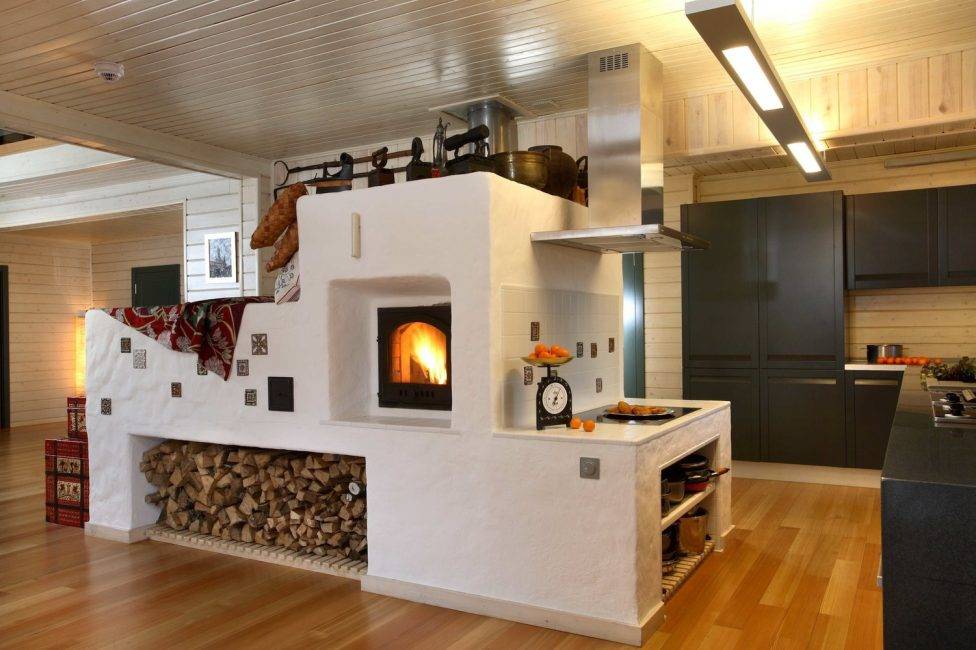 Если выбирается конструкция для деревянного дома, лучше отдавать предпочтение истинно русскому стилю. Декор может быть выполнен несколькими вариантами: с использованием строительных материалов (штукатурки и краски) или традиционной мазанки. Такие конструкции будут гармонично смотреться и наполнять кухню уютом и комфортом.