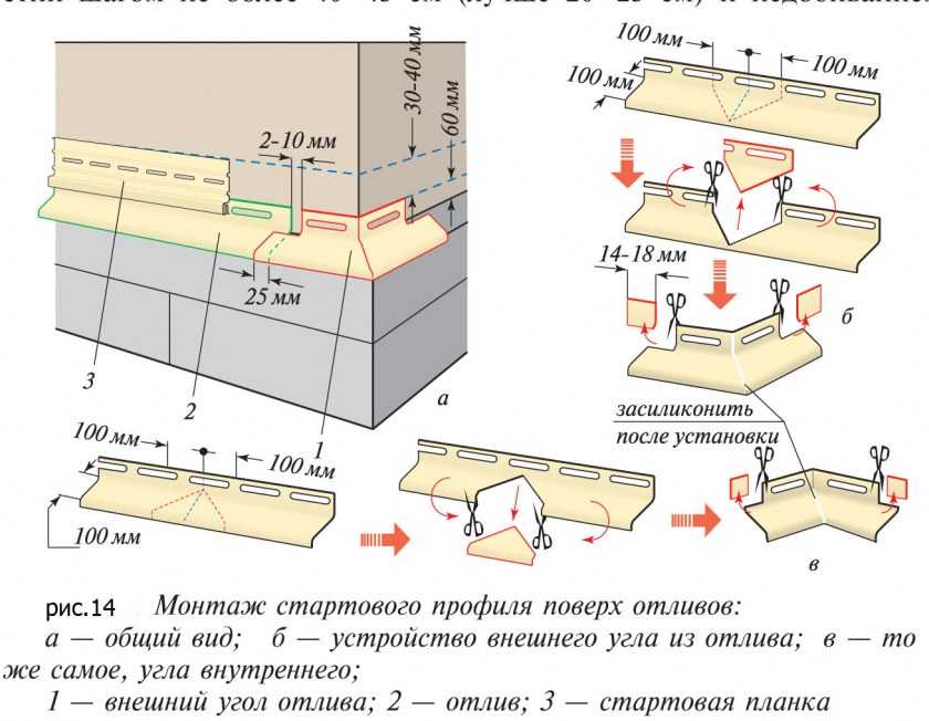 Внешние и внутренние углы устанавливаются так, чтобы нижний край был на 4-6 мм ниже стартового профиля, а верхняя часть на 1-3 мм ниже соффита или карниза