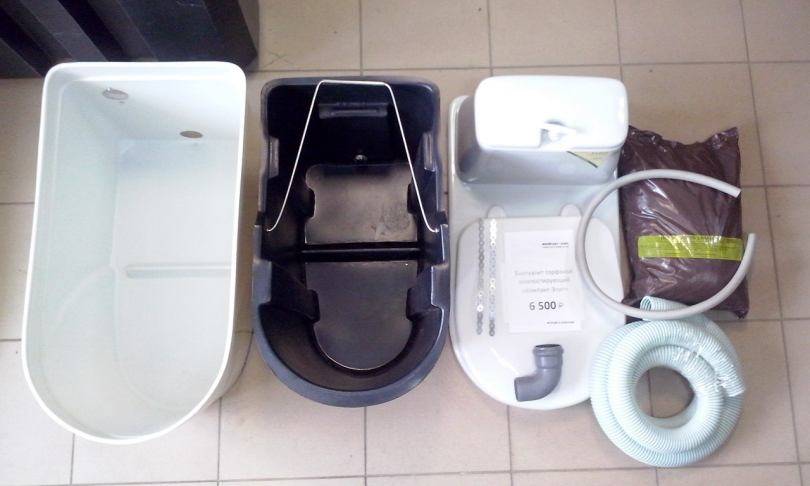 Устройство с механизмом сухого смыва выдержит максимальную нагрузку в 150 кг. В комплект входит трёхметровая труба для вентиляции диаметром 75 мм, дренажный шланг с хомутом, 3 соединительные муфты, торфяной накопитель на 30 л.