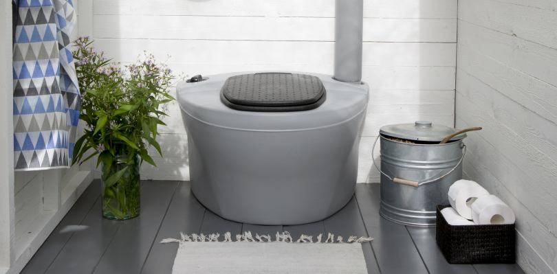 Простой и комфортный финский экотуалет чаще всего используется на дачах. Вес конструкции 15 килограммов, высота сиденья 50 сантиметров. Функционирование устройства основано на сухом сливе, при котором торф попадает в накопительную камеру объемом 110 литров и запускает процесс переработки фекалий. Торфяной наполнитель поглощает влагу, но не в достаточных объемах, поэтому ее необходимо выводить через дренажную систему.