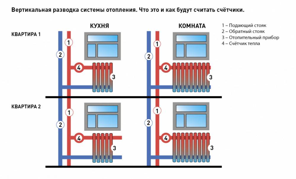 Квартиры в многоэтажках оборудованы либо вертикальной, либо горизонтальной разводкой отопительной системы. В многоквартирных домах, построенных до начала XXI века, системы отопления разводились вертикально.