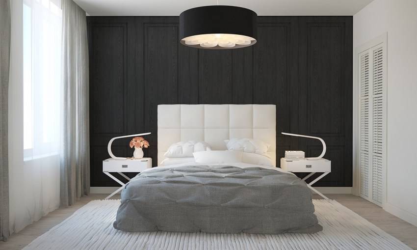 Серый с черным в классическом стиле подходит для чисто мужской спальни. Но достаточно ввести в эту цветовую гамму горошек, пейсли или дамаск и получится семейная спальня.