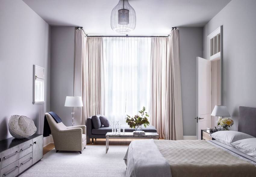 Отдельного упоминания достойны плотные серые шторы в спальне, они элегантно смотрятся в сочетании с белыми легкими тканями, и дают возможность затемнить комнату.
