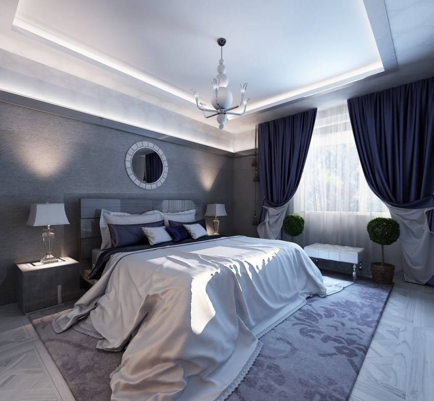 Классический стиль не может обойтись без применения фиолетового и розового в оформлении спален, отделка которых выполнена в светло-серых тонах. Шторы, покрывала и потолок с приглушенными оттенками этих цветов создают роскошную и романтическую обстановку.