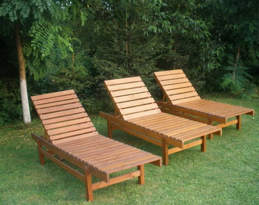 Основным параметром, в зависимости от которого классифицируются лежаки, является материал. Востребованы деревянные модели, которые легко сделать самостоятельно. Мебель может быть простой прямой формы, а основания, повторяющие контуры тела, очень удобны. Лёгкая фиксация положения спинки, выдвигающиеся полочки, удобные подлокотники и устойчивые ножки делают шезлонги из дерева удобными и практичными. Наличие колесиков облегчает транспортировку мебели. При этом деревянные модели экологичны, безопасны и долговечны.