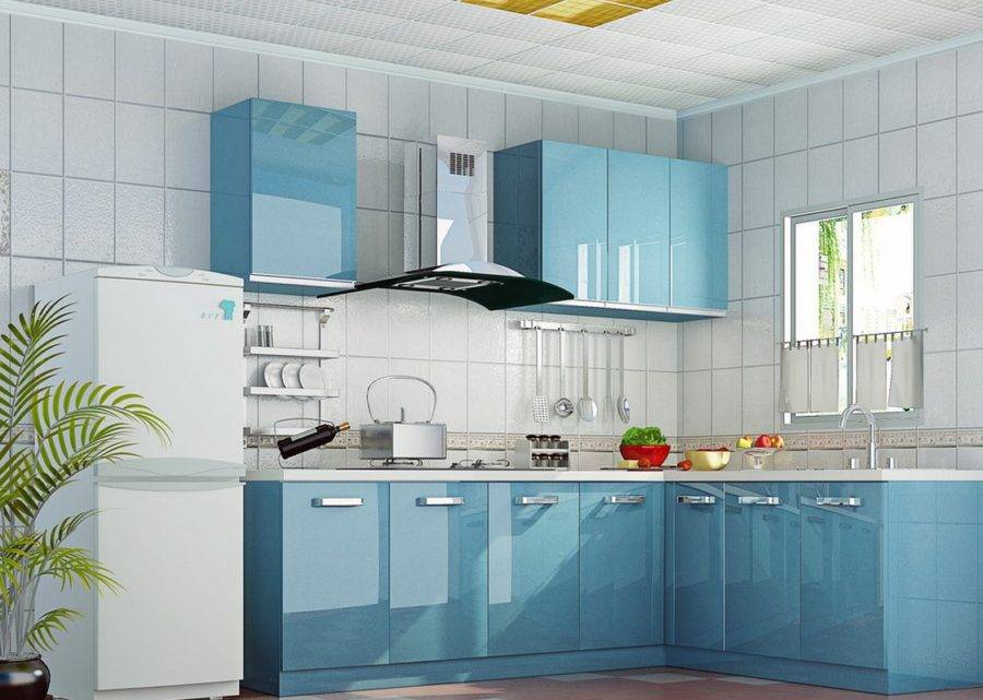 Стоимость кухонного гарнитура зависит от вида пластика (HPL, CPL), материала, из которого изготовлен каркас, — МДФ, ДСП, способа обработки торцов — профиль из алюминия, кромка из ПВХ. Престижно и дорого выглядит мебель, изготовленная по технологии постформинг. Для помещения с доминирующим синим цветом легко подобрать гарнитур с пластиковыми фасадами. Это позволяет цветовая гамма изделий. Поверхности, оклеенные пластиком, устойчивы к механическим повреждениям, влаге, с годами не блекнут.