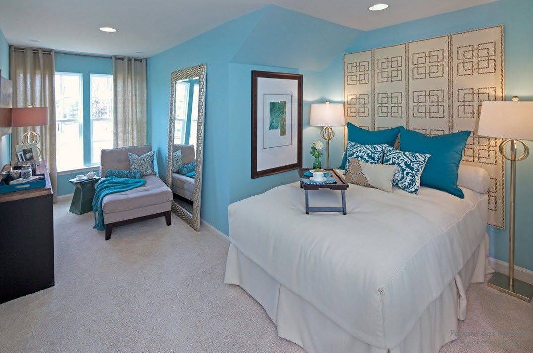 Для спальни с окнами на север подойдут более яркие тона синего, приближенные к зеленому (бирюзовый).