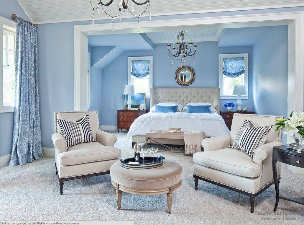 Голубые тона в интерьере спальни создают атмосферу умиротворенности, духовности, надежности и уверенности.