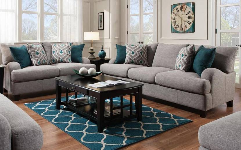 Серый дизайн с сиреневыми акцентами становится по-настоящему элегантным и загадочным, особого внимания заслуживают бирюзовые колеры, которые наделяют гостиную королевским видом.