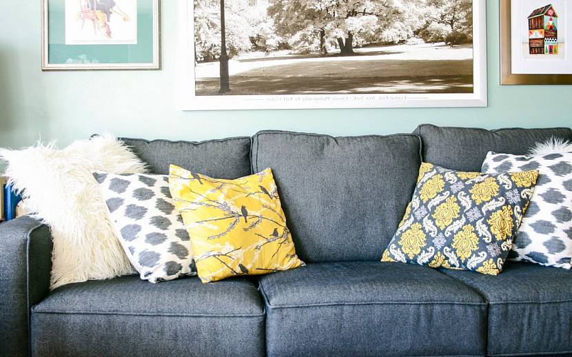 Декоративные подушки. Они станут последним штрихом дизайна. С их помощью серый диван станет уютнее. Подушки могут иметь синий, желтый, зеленый, красный, фиолетовый оттенки.