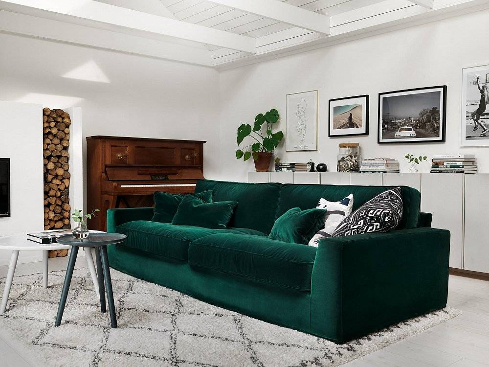 Особенно актуальным предметом стал темно зеленый диван, универсальность которого заключается в практичности и простоте при обустройстве жилища.