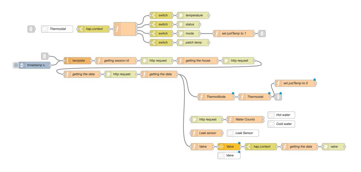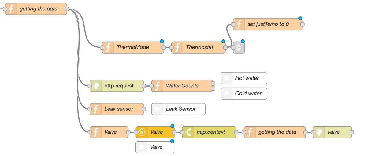 На самом деле, если вы уже хотя бы немного разобрались как работает Node-RED, как создавать там HomeKit-устройство, то вы скорее всего просто ждете ссылку с flow — дальше вы разберетесь. Поэтому держите — здесь вы найдете пример с flow, включая шаровые краны, управление теплым полом и фиксации протечек (необходимо только на местах комментариев добавить HomeKit блоки) + не забудьте поставить свои credentials в первом блоке.