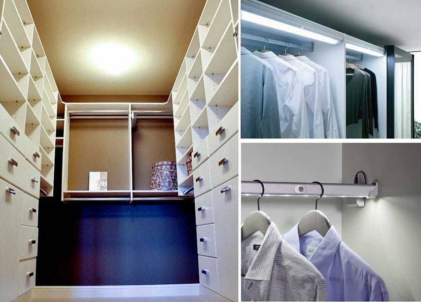 Для установки наверх лучше выбрать встроенные точечные светильники, чтобы не красть высоту помещения и не задевать руками люстру при переодевании. Для полок удобнее всего использовать светодиодные ленты. При желании можно установить лампы с датчиком, которые будут включаться от движения или при открывании дверей.