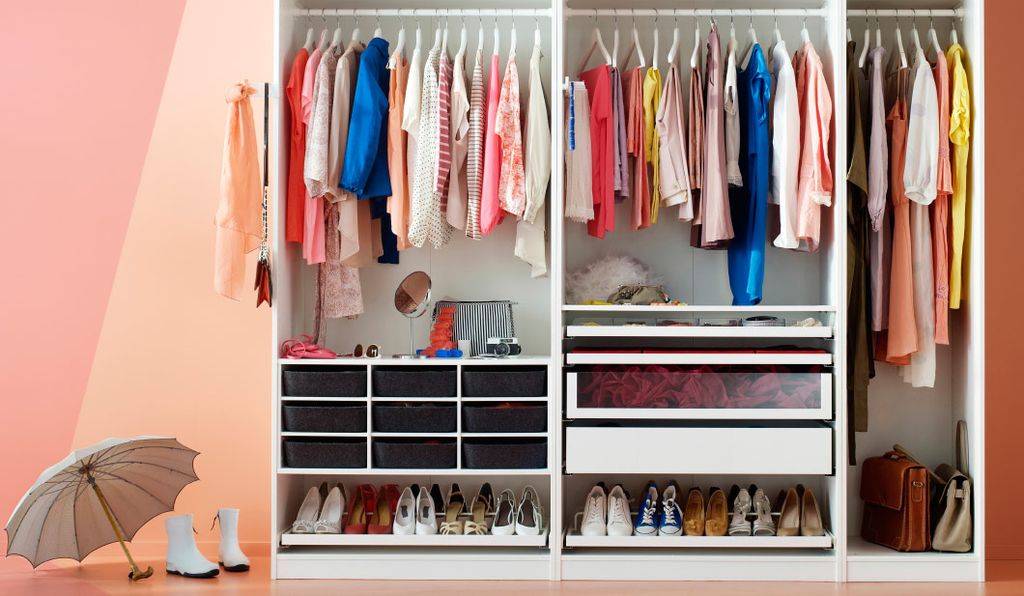 - Сезонной одежде лучше выделить место на верхних полках, чтобы теплые свитера не мешались под рукой летом. И наоборот, чтобы легкие платья не висели рядом с пуховиком.