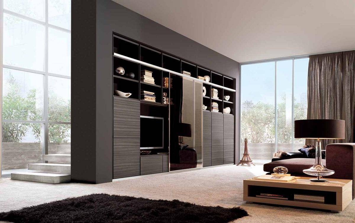 Здесь отлично смотрится встроенный шкаф с нишей в центральной части и стеллажами по бокам. Она может «обрамлять» камин или медиа-зону, одновременно выполняя функцию места для хранения и презентации различных вещей. При отсутствии телевизора центром композиции может стать аквариум. Для современной гостиной выбирается мебель из ЛДСП, МДФ с раздвижными дверцами. В классическом интерьере хорошо смотрится деревянная конструкция с распашными створками.