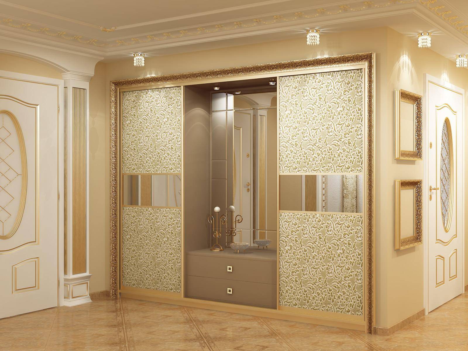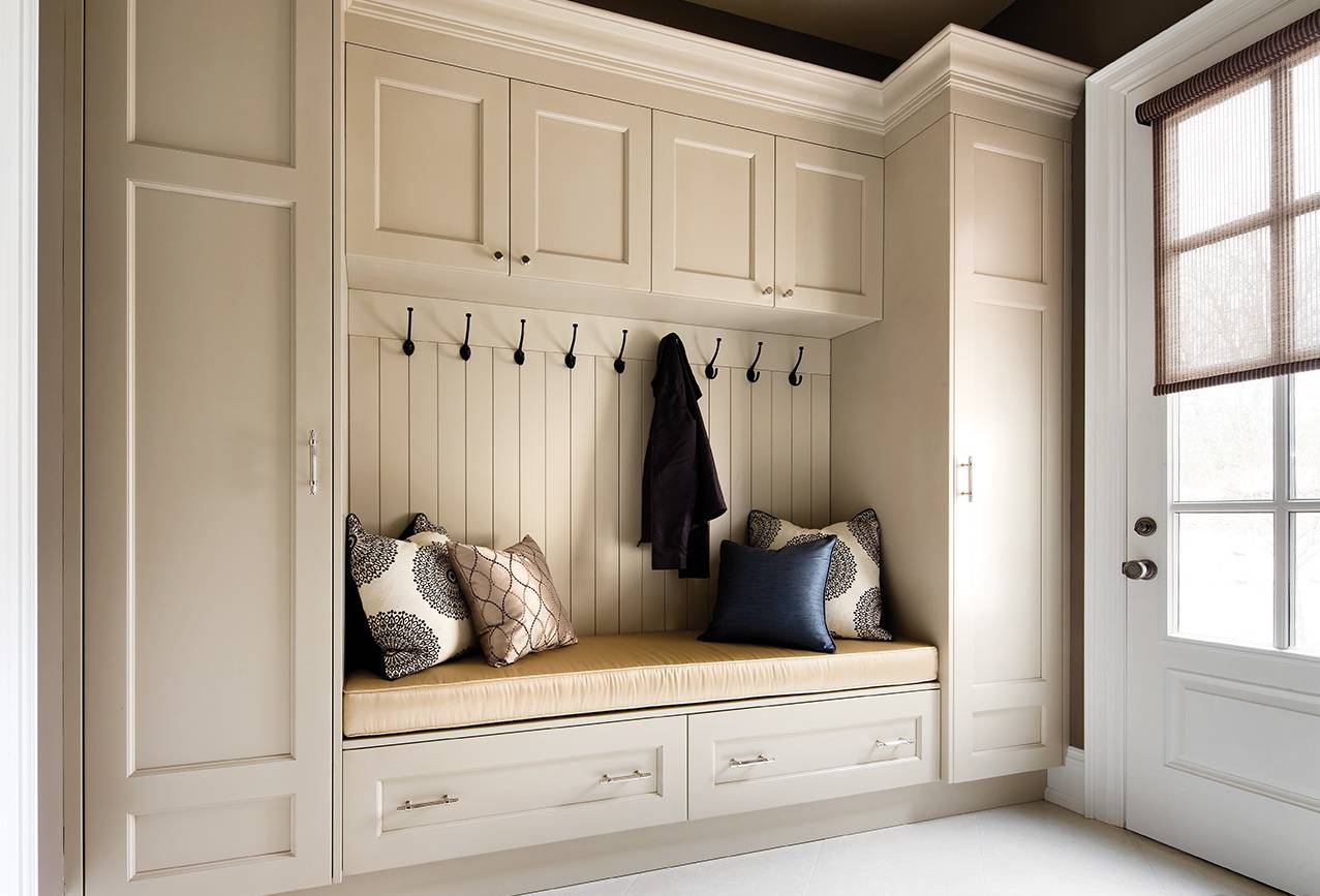 Если помещение просторное, в один из его углов ставится встраиваемый шкаф или он собирается у длинной стены. Для широкой комнаты лучше выбрать вариант, когда конструкция монтируется у входной двери или обрамляет ее. Для тесного или узкого помещения хорошим решением станет мебель с раздвижными дверками. Стандартная глубина систем хранения равна 45–60 см. В маленькой прихожей можно пренебречь этим параметром и максимально использовать вертикальное пространство. Рекомендуется сделать предмет интерьера до потолка, установив наверху антресоли.