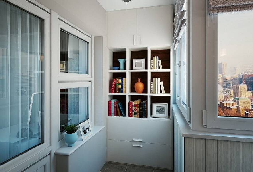 Когда пространства достаточно, встраиваемый шкаф на лоджию ставится в углу либо полностью занимает одну из ее стен. Если балкон небольшой, но широкий, мебель собирается у двери. Над проемом вешается вместительная антресоль. Так как места в помещении достаточно, глубина конструкций может быть максимальной — 0,6 м.