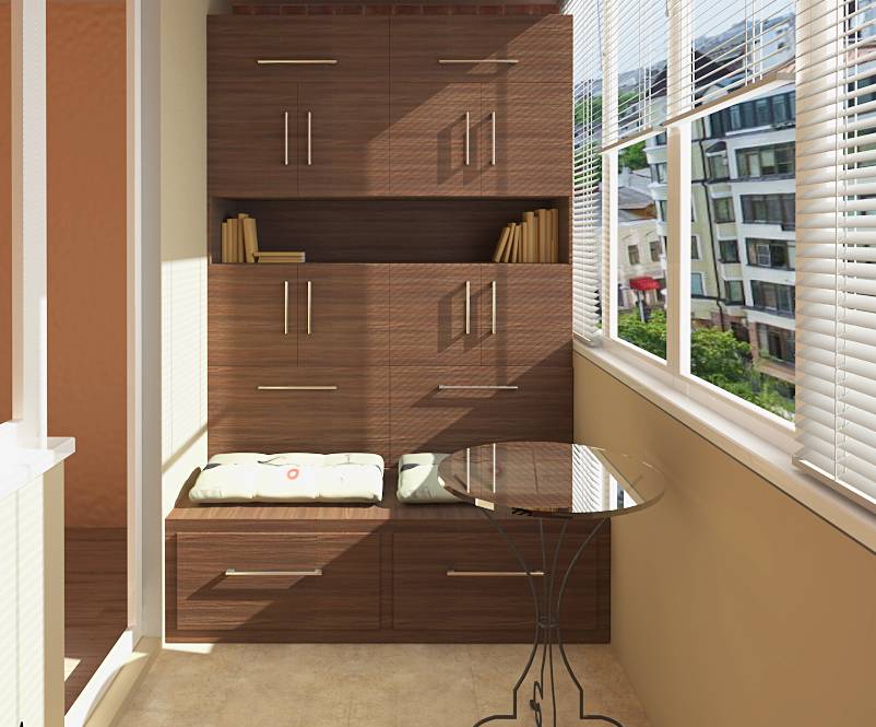 Особенность встроенной мебели на балкон состоит в том, что она не может быть габаритной. Дальний от проема угол можно занять комодом либо тумбой. Балконные шкафы должны соответствовать высоте ограждения. Их каркас закрепляется к несущей стене. Если балкон открытый, мебель не защищена от сезонных температур, воздействия атмосферной воды