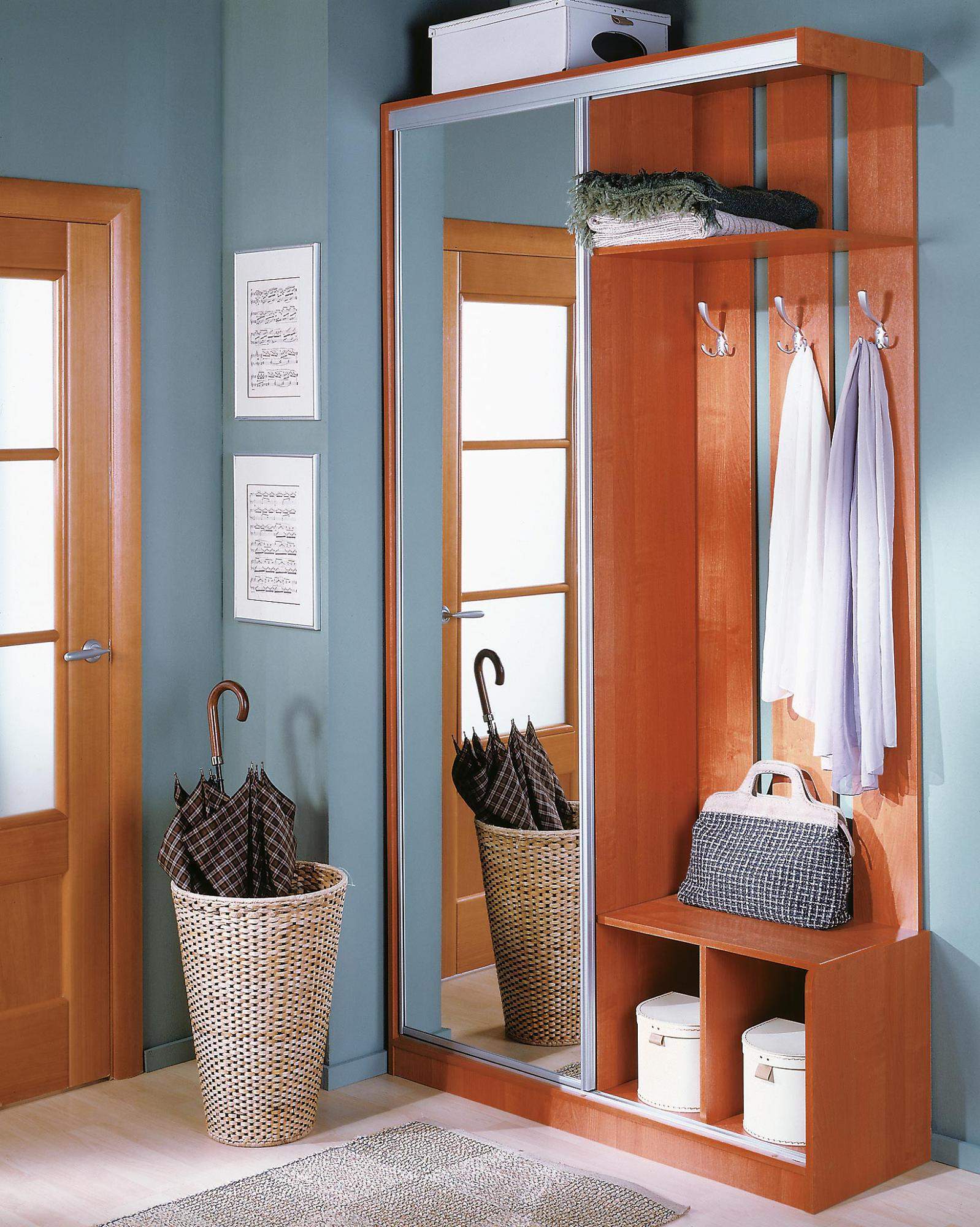 Если ниши в квартире нет, всегда можно в дополнении к шкафу найти место для тумбочки или комода. Красиво смотрится и отдельно стоящая вешалка для легкой верхней одежды.