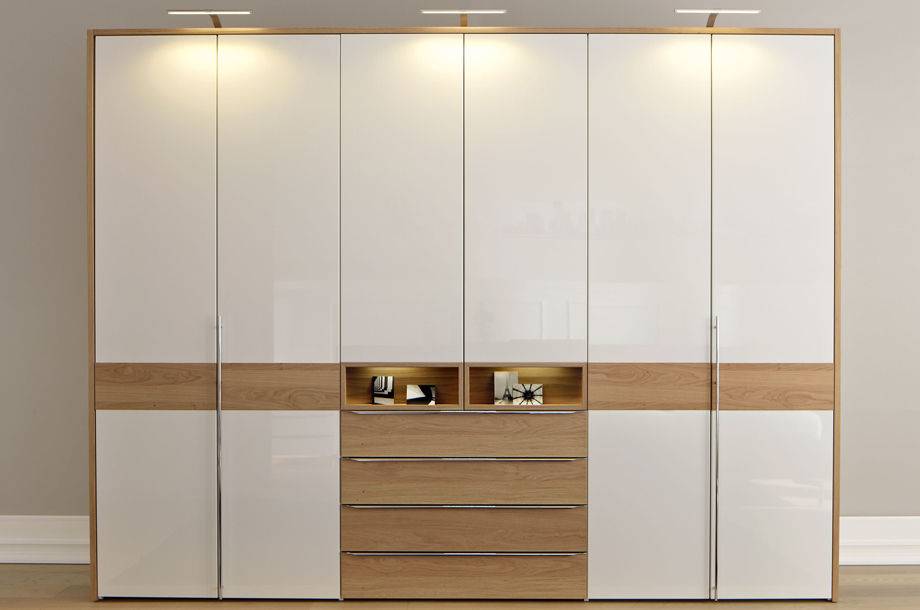 - прямую — вместительные, многофункциональные модели шкафов. Их лучше всего использовать в просторных помещениях. Они могут напоминать расположенные рядом одинаковые двустворчатые шкафы, либо представлять собой сочетание большого центрального отсека и двух дополнительных боковых отделений по краям (с ящиками и полочками);