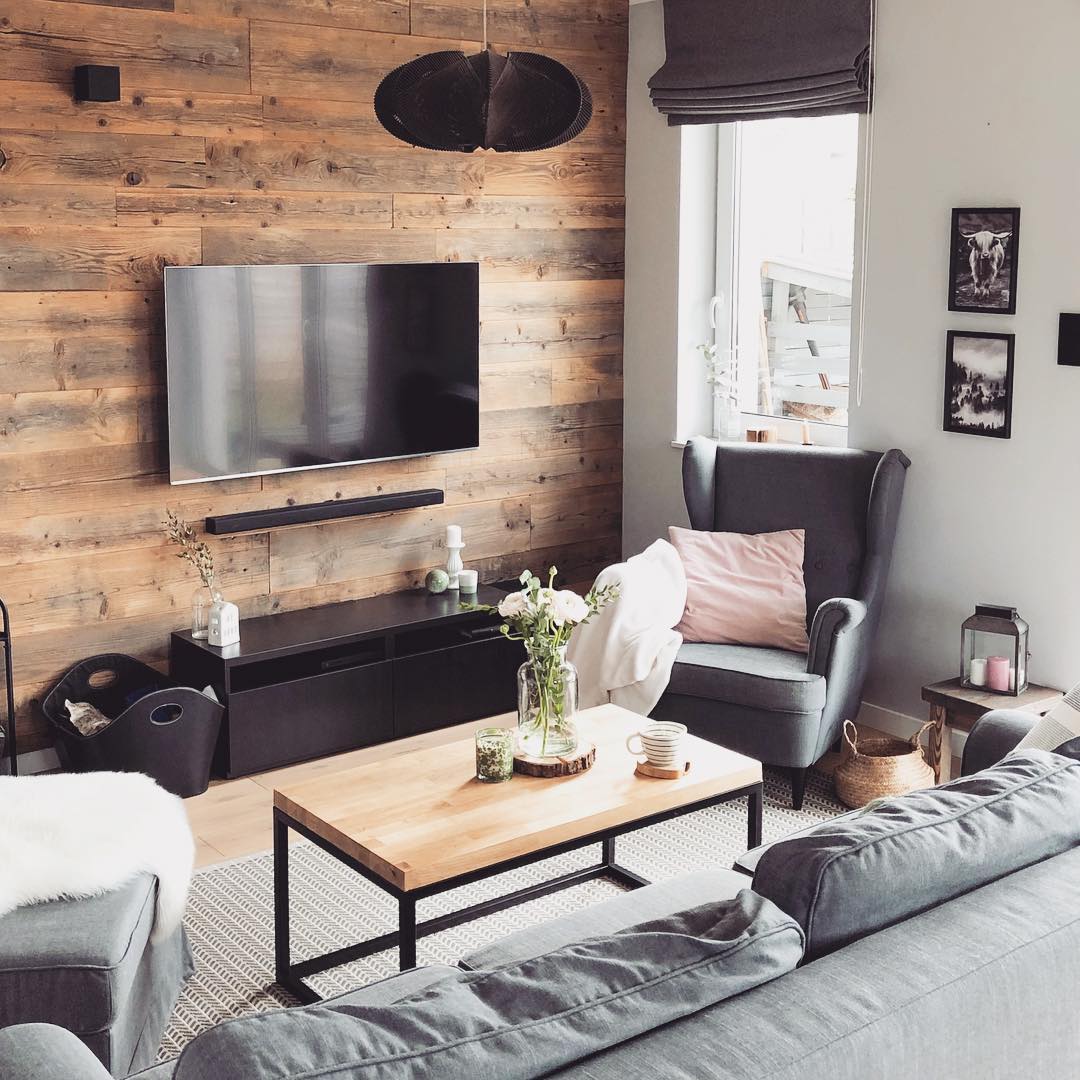 акцентная стена, покрытая деревянными панелями, вагонкой, кирпичной кладкой, штукатуркой альтернативного оттенка;