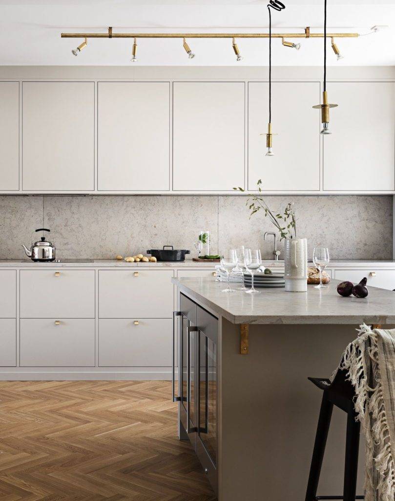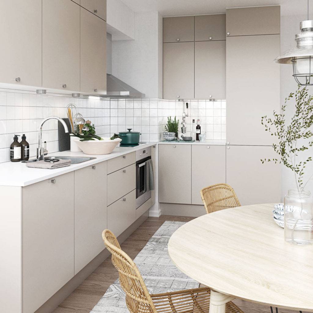 Дизайн светлой кухни в скандинавском стиле ― минимализм, много света, натуральные текстуры (хлопок, дерево, цветы). Это почти всегда бежевые, серые, белые цвета, растения в горшках, кадках.