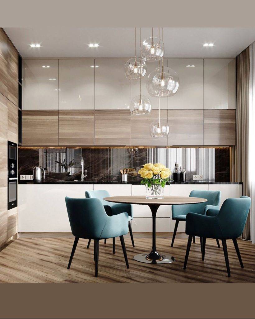 Конечно, этот цвет больше подходит для просторных помещений. Однако в небольших комнатах так же можно делать акцент на синем. Это могут быть детали, декоративные предметы, кухонная утварь. Даже подсветка голубого оттенка будет вполне уместной в простом светлом дизайне.