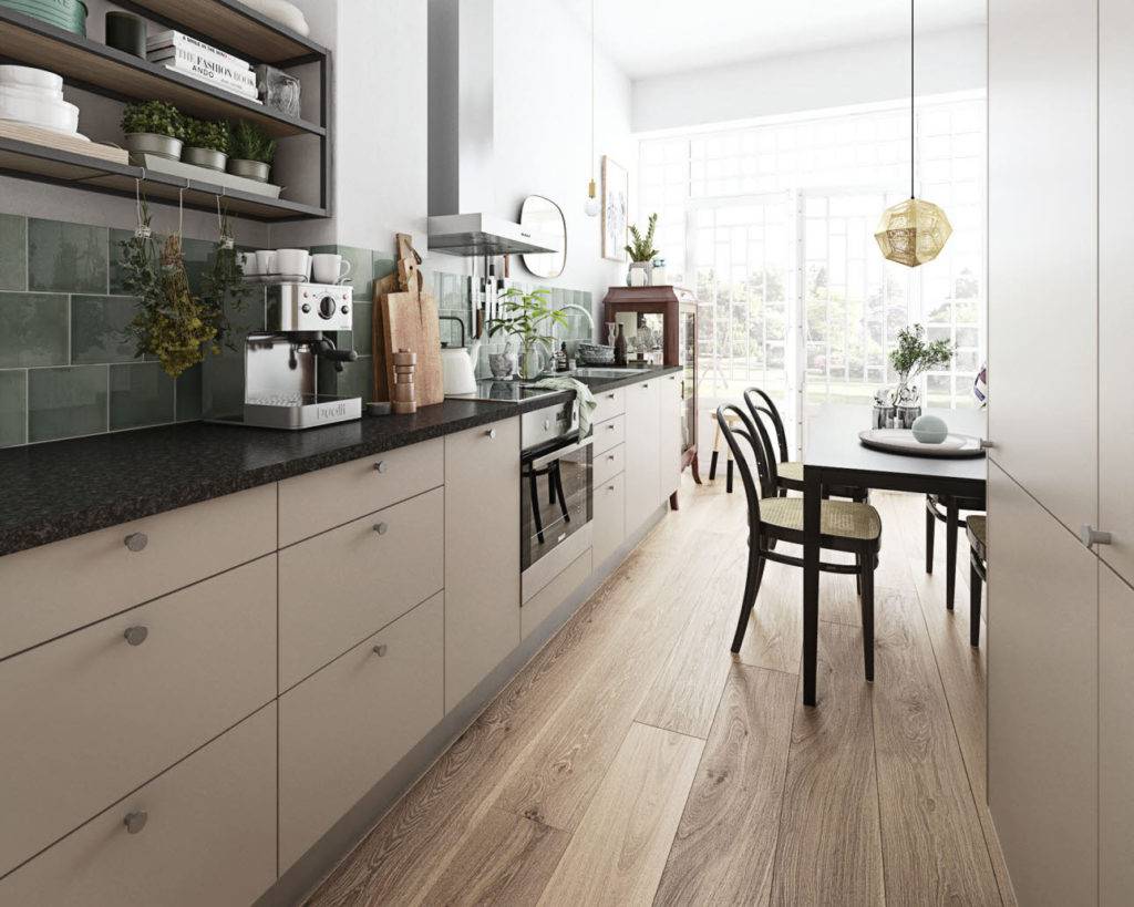 5. Серый с зеленым. Вся зеленая палитра благоприятно действует на психику человека. Хотите оформить интерьер в стиле эко? Используйте серые и зеленые цвета. В дизайн можно гармонично вписать натуральные материалы в качестве акцентов. Это может быть столешница, фартук, часть фасадов.