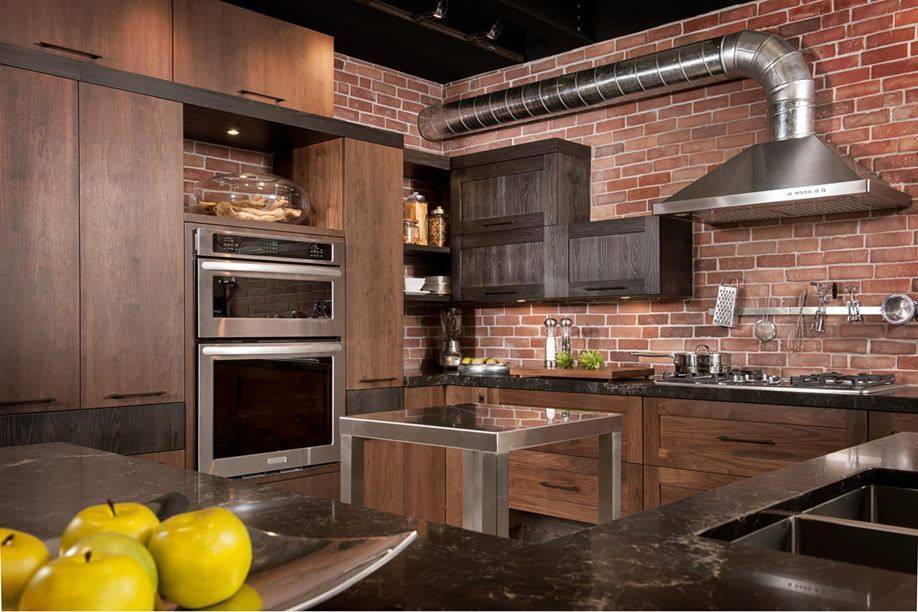Лофтом называют индустриальный стиль кухни, обладающий своего рода мужским характером. Для него характерны нарочитая небрежность, использование грубых отделочных материалов и практически полное отсутствие традиционного декора. Стены кухонь в стиле лофт выполняют с имитацией под кирпич или бетон – с этой задачей справляются декоративный кирпич и рельефная штукатурка. Пол чаще всего дощатый – из паркетной доски или ламината под древесину. Иногда используют керамическую напольную плитку или оставляют голую бетонную поверхность.