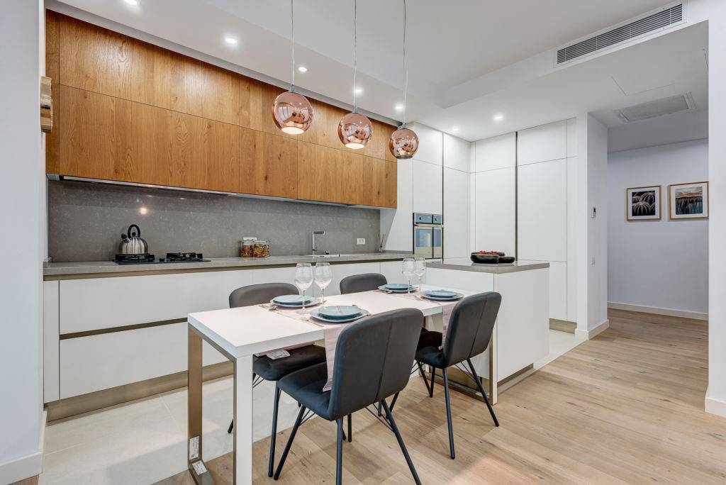 Разрабатывая дизайн-проект модной кухни 2022 важно помнить, что очень светлые и темные цвета должны занимать наименьшую долю пространства – не более 10%. Окончательно расставить акценты в помещении помогут элементы декора