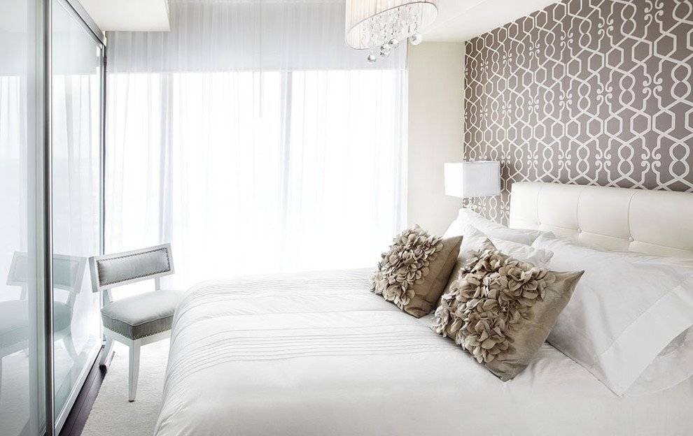 Красиво оформленное изголовье помогает акцентировать внимание на кровати. Замечательное дизайнерское решение – это стена, акцентированная обоями другого оттенка или фактуры