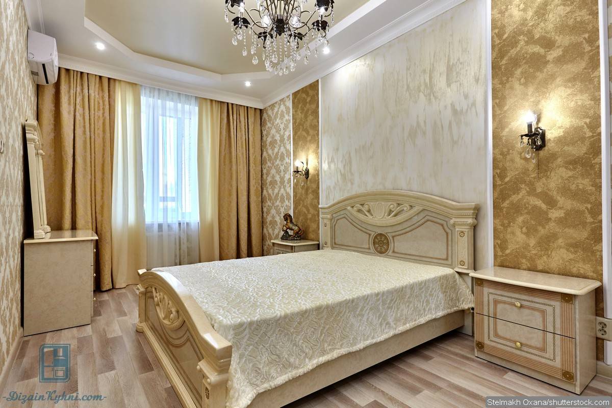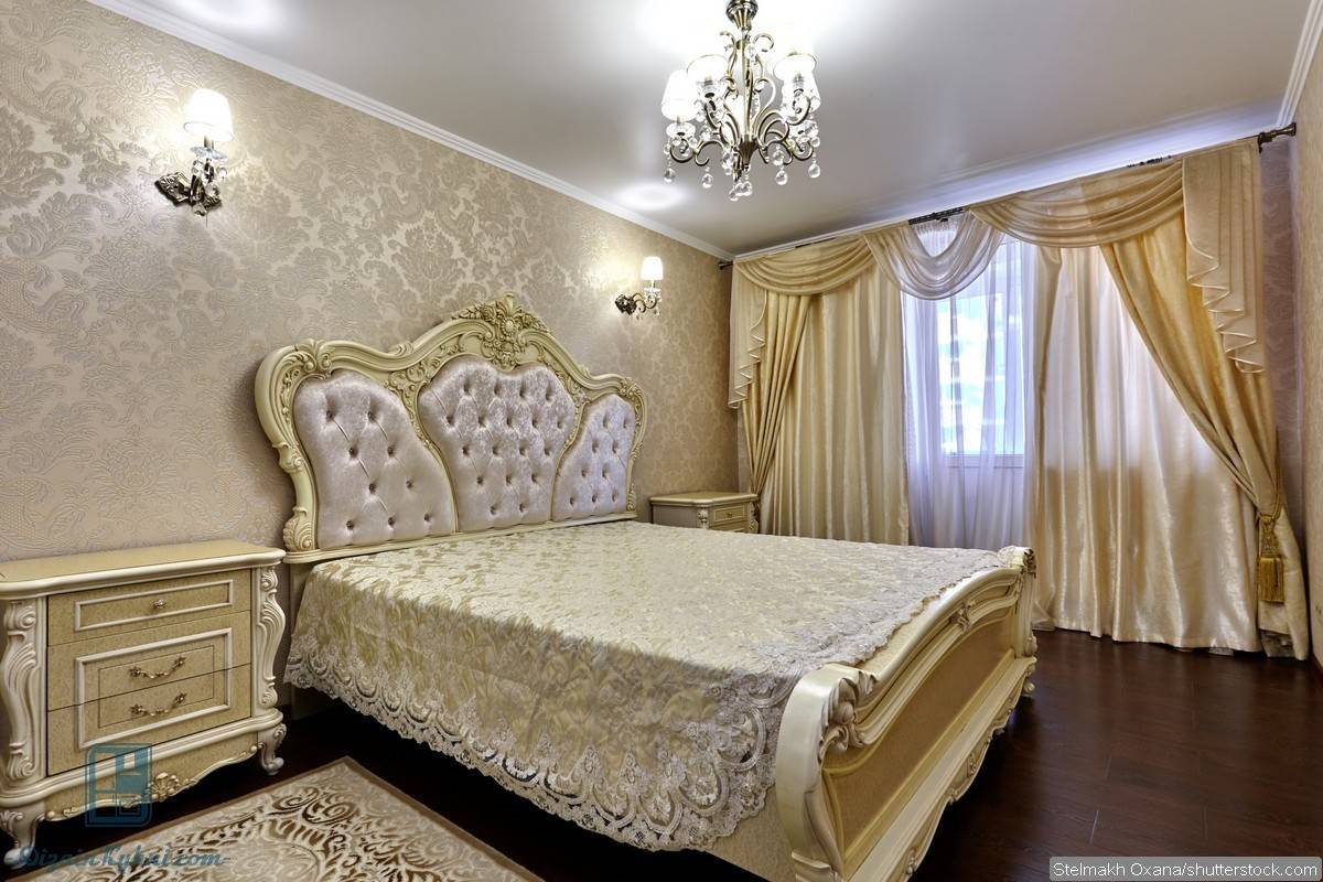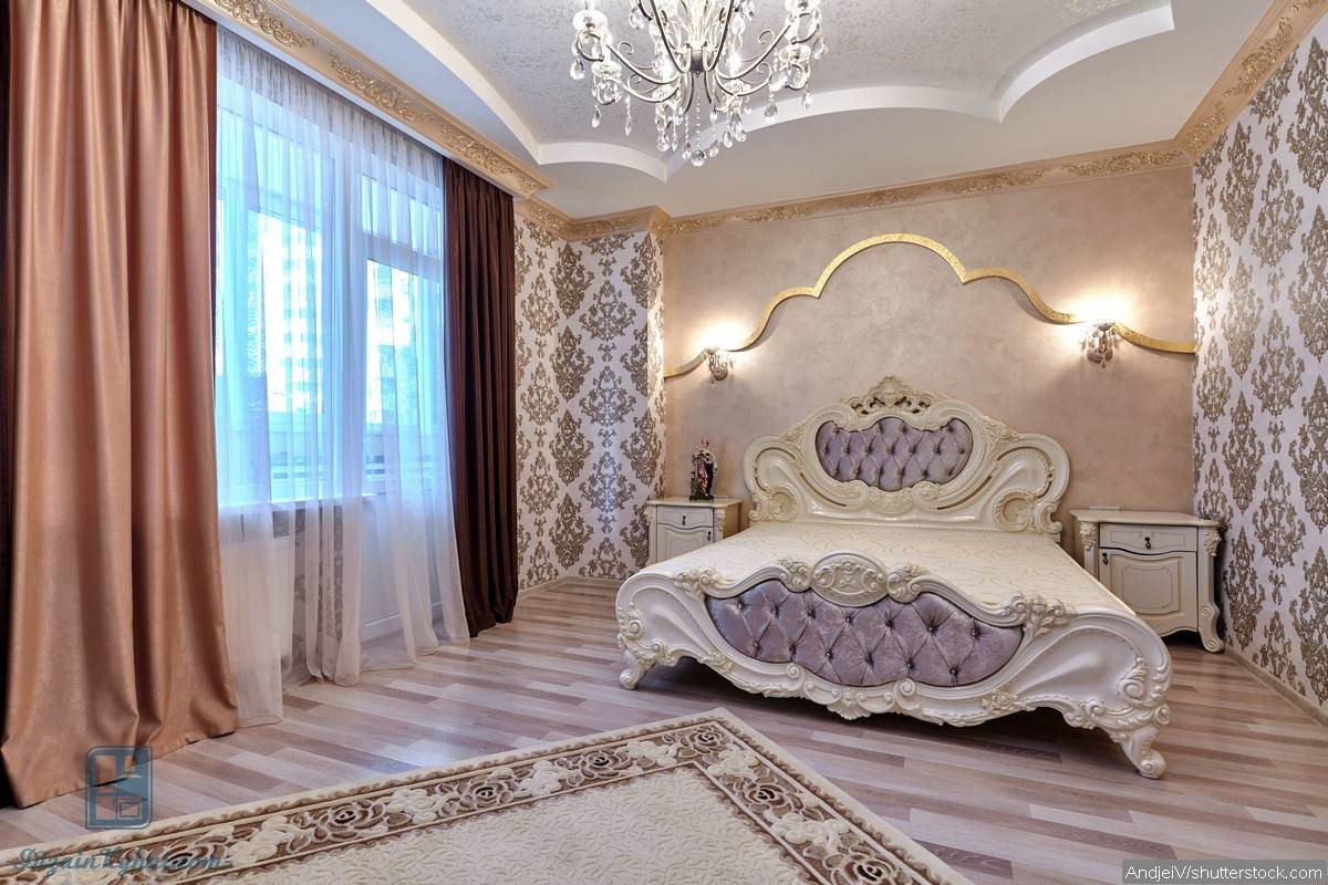 - В дизайне спальни непременно должна присутствовать лепнина, которой рекомендуется декорировать потолок или розетки, а также проемы дверей и окон или другие элементы помещения;
