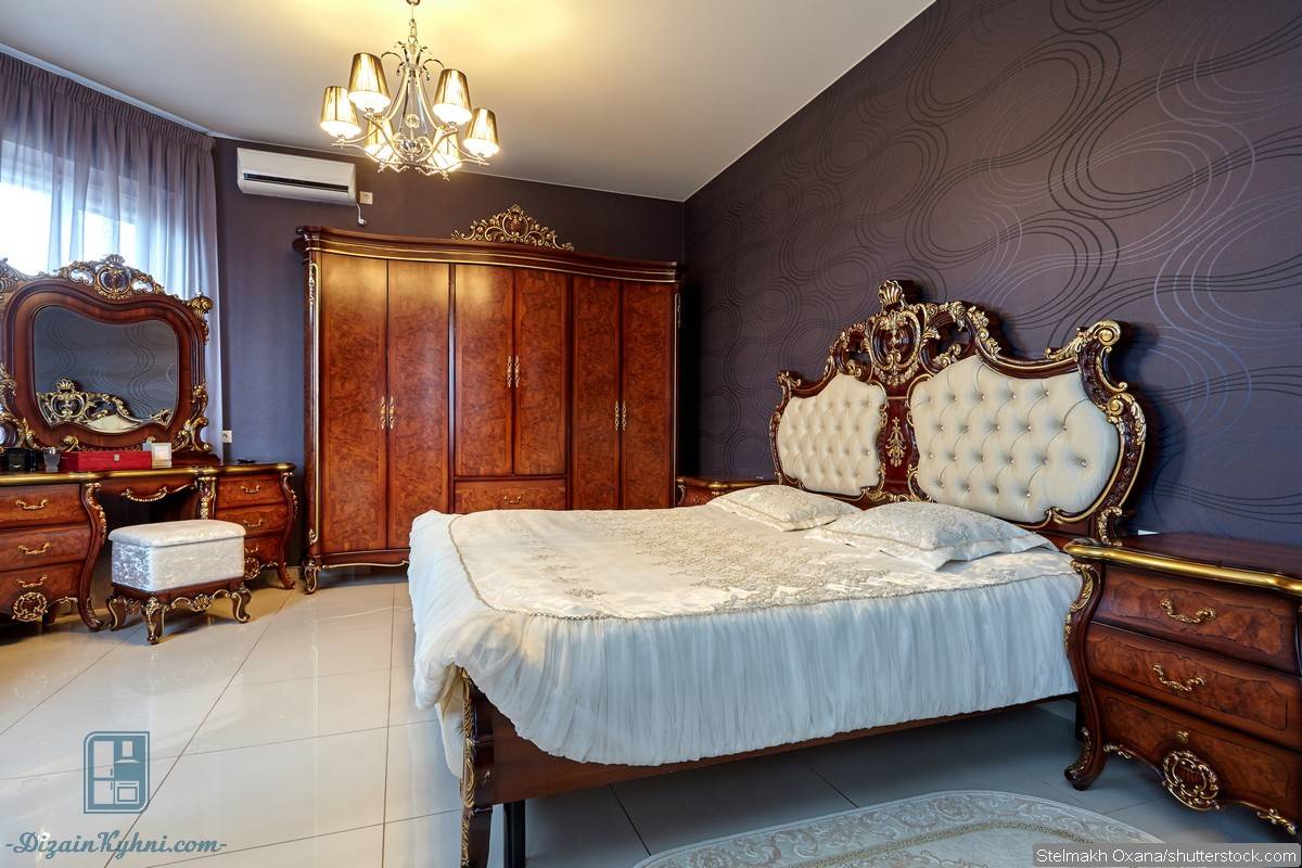 Только высококачественным породам дерева позволено украшать спальню в классическом стиле. К обстановке с коричневой мебелью лучше всего подходит отделка бирюзовым, кремовым, бежевым и золотым цветами. Чтобы оттенки мебели выглядели благородно и презентабельно, фасады покрывают слоями красно-коричневого, шоколадного или каштанового лака, сохраняя при этом текстуру древесины.