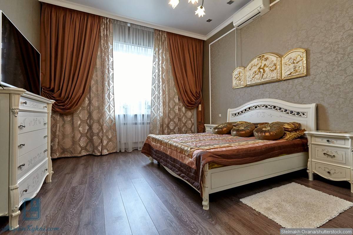 Дизайн спальни в классическом стиле в коричневых тонах.