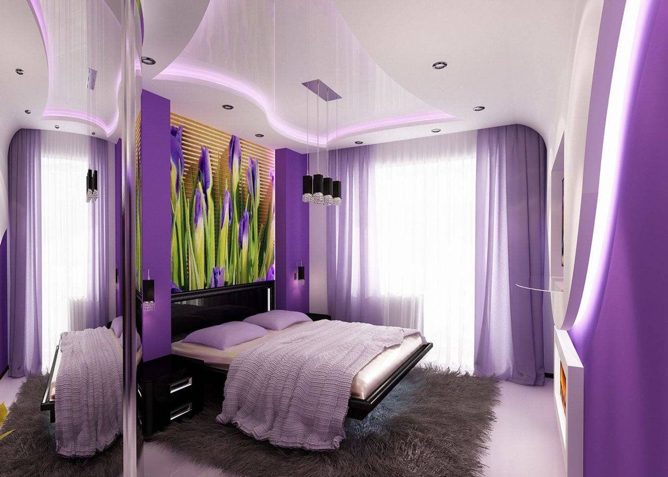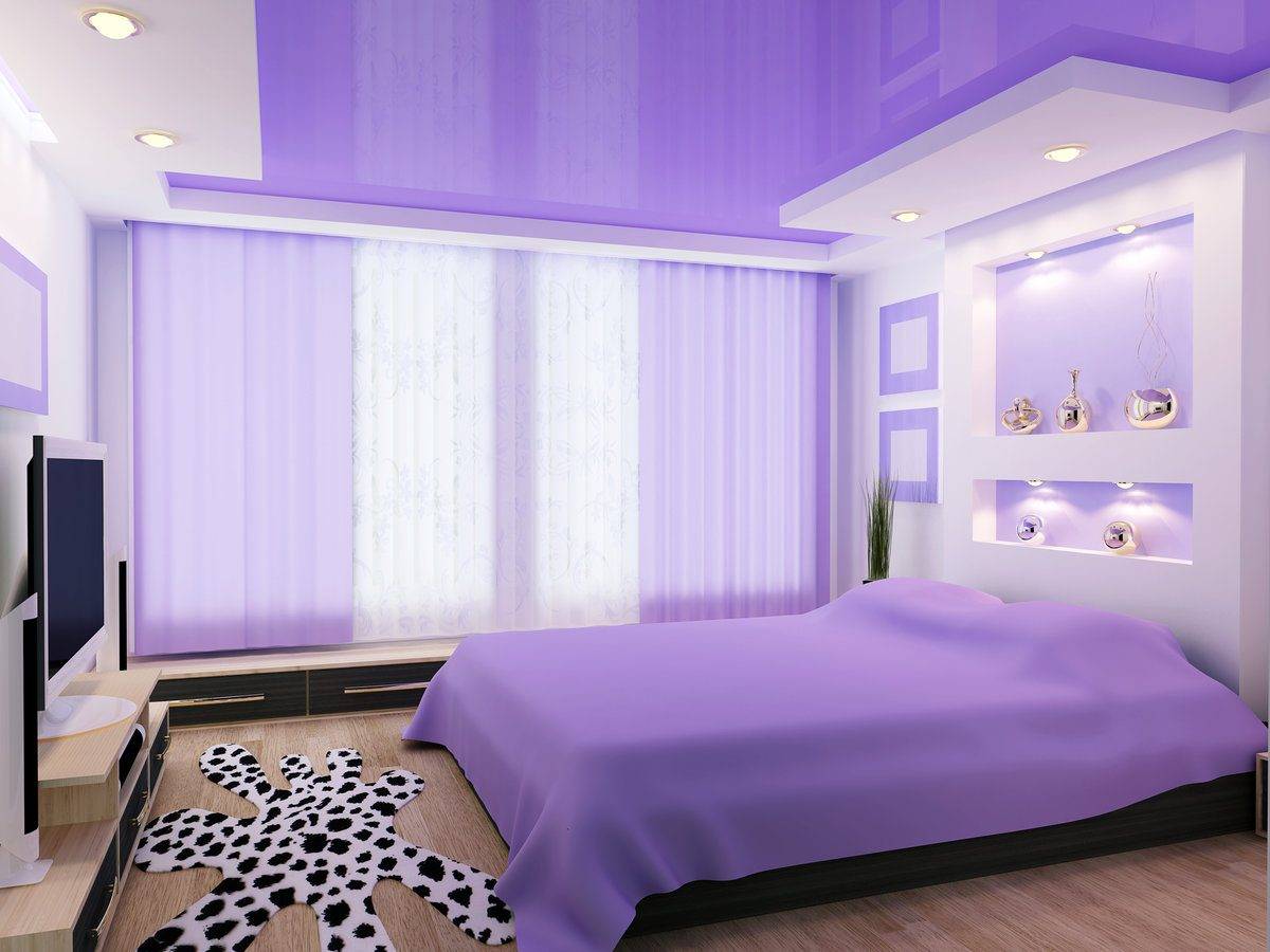 Светлые и размытые оттенки – в предпочтении, они не напрягают восприятие и не перегружают общую гамму. Стены как бы раздвигают пространство, особенно с неоновой или диодной подсветкой. Комната кажется чисто вымытой, наполненной свежими весенними ароматами. В маленьком помещении отлично смотрится дополнение в виде фиолетового текстиля (шторы и покрывало кровати) или изящных аксессуаров.